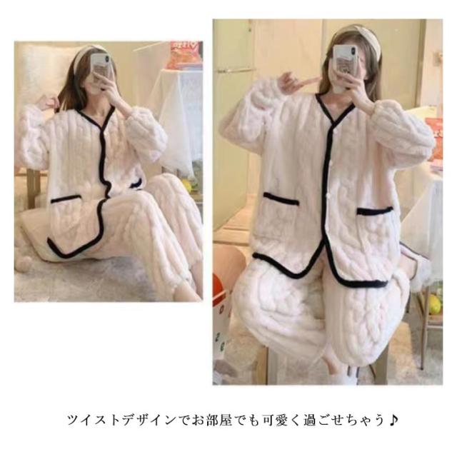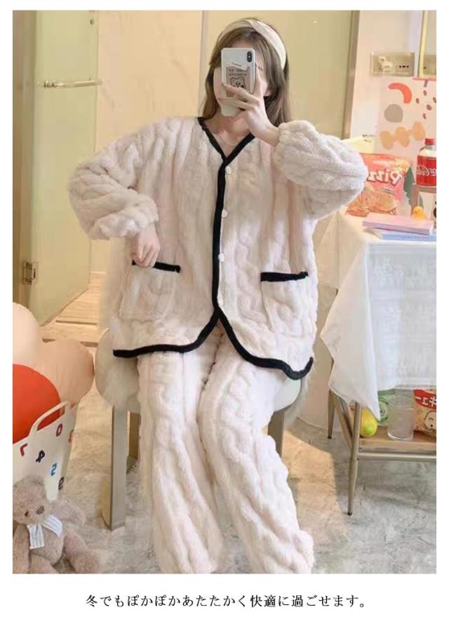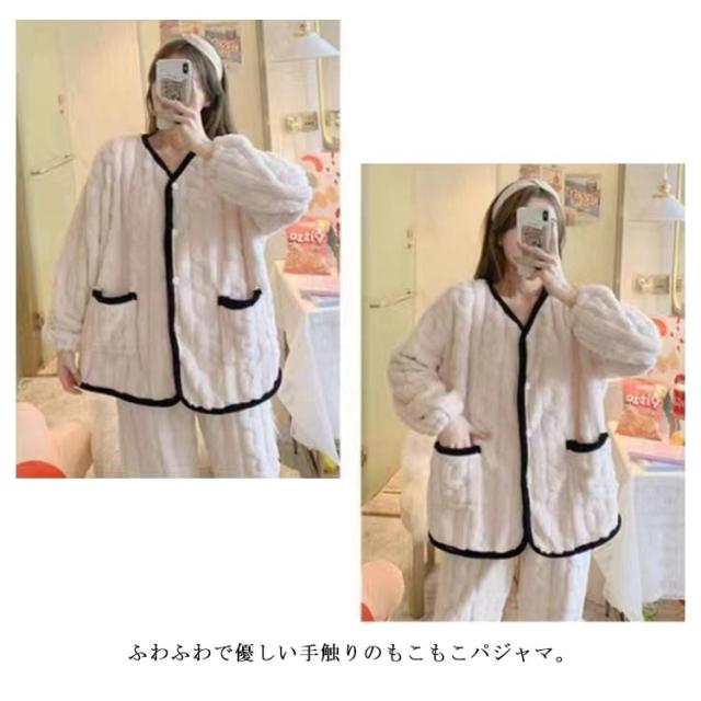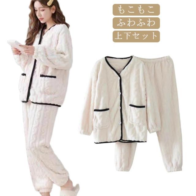 ルームウェア セットアップ 冬 レディース 長袖 ふわふわ パジャマ もこもこ ルームウェア 防寒 ふんわり 上下セット 前開き ルームパンツ トップス 2点セット 部屋着 ゆったり ノーカラー 起毛 ロングパンツ 無地 ウエストゴム リラックス