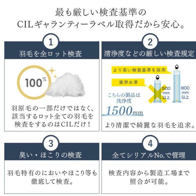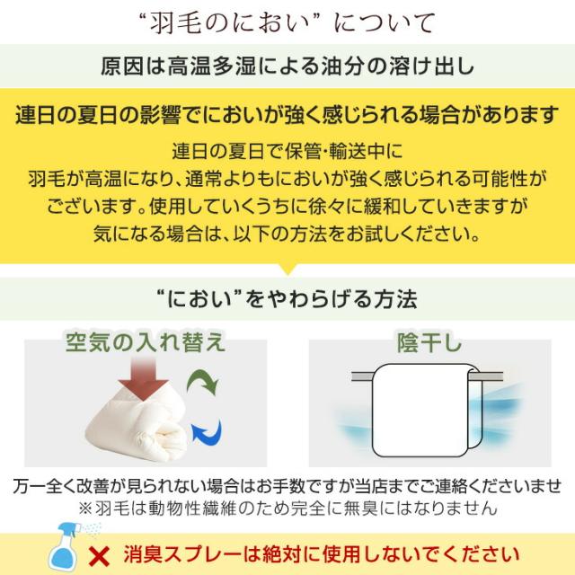 ※洗浄を十分に行っておりますが、開梱直後や温度・湿度等の環境等により臭いを感じる場合がございますので、開封直後には風通しの良い場所での十分な陰干し等をお勧めいたします。なお、天然羽毛の臭いのため人体に害はございませんのでご安心ください