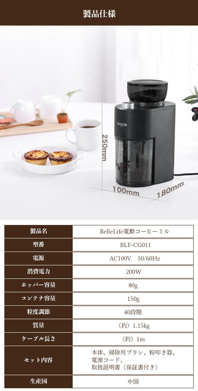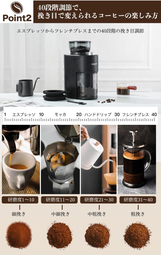 コーヒーミル 電動 コーヒーグラインダー 極細~粗挽き 40粒度 コーヒー粉砕機 珈琲ミル 静電気飛散防止 豆挽き ブラシ付
