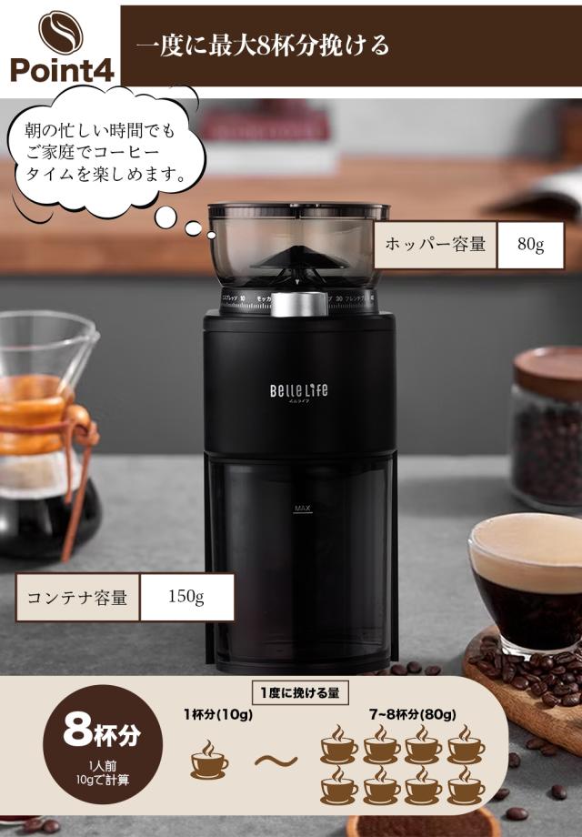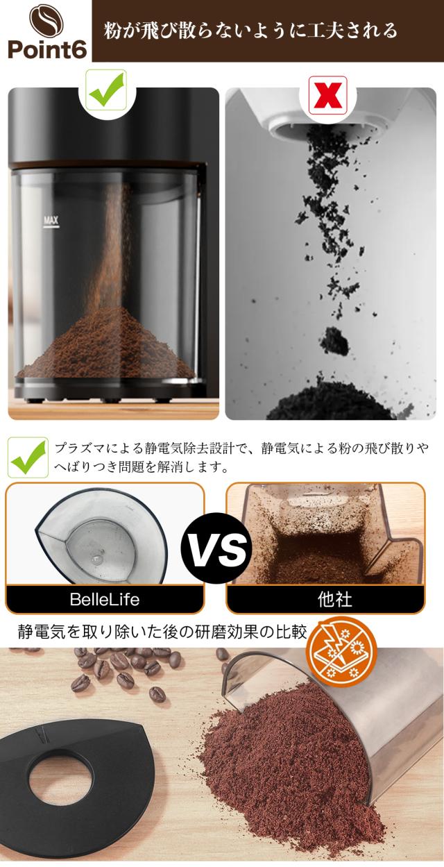 【鮮度と風味を最大限に引き出す】Bellelifeコーヒーミルは、常に新鮮なコーヒー豆を使って美味しい一杯を楽しむために設計されています。豆を挽く直前に研磨することで、豆の本来の風味や香りを最大限に引き出します。パワフルなグラインダーが豆を均一に挽き、粉末が一貫して同じ質感であり、コーヒーの抽出効率も向上します。