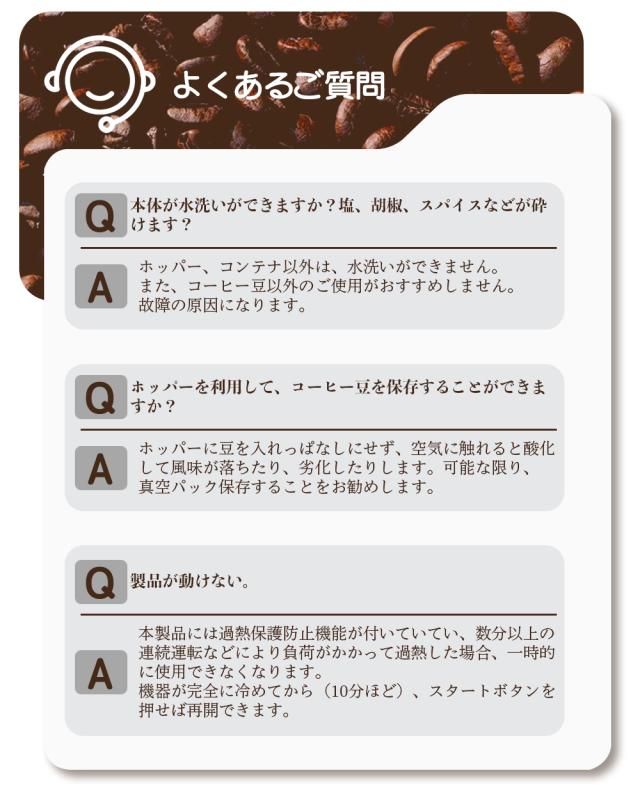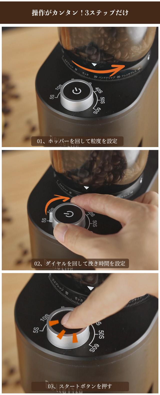 【操作簡単・自由な研磨調整】直感的な操作方法と使いやすいデザインで、誰でも簡単に使える珈琲研磨機です。タッチパネルやボタン操作により、瞬時に豆を挽き始めることができ、忙しい朝でも手軽に美味しいコーヒーを楽しむことができます。個々の好みや抽出方法に合わせて、研磨の粗さ、時間を自由に調整できます。エスプレッソ用の微細な研磨から、フレンチプレス用の粗めの研磨まで、幅広い調整範囲で理想のコーヒーを実現します。