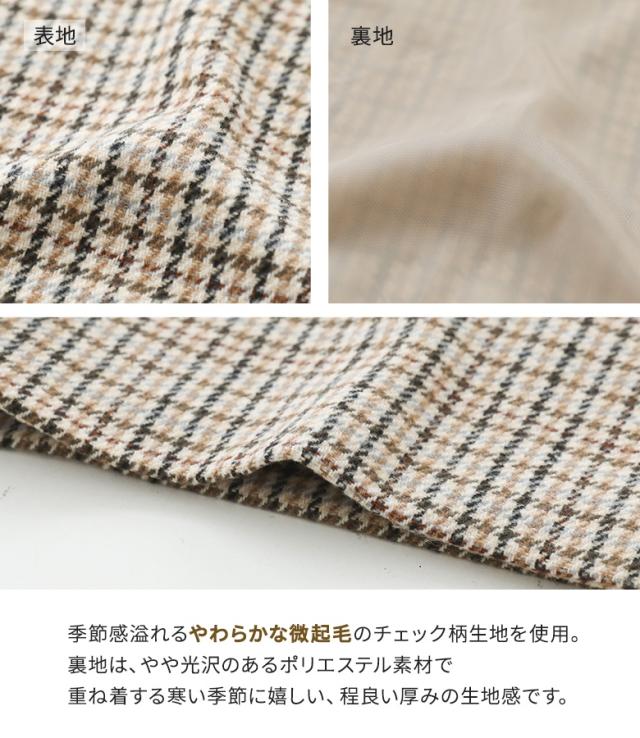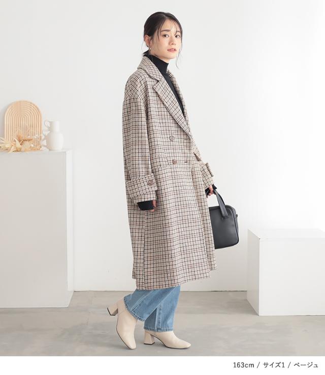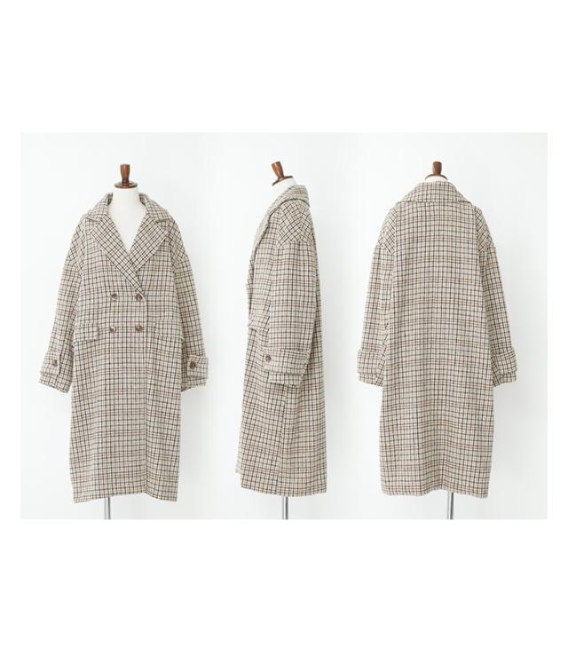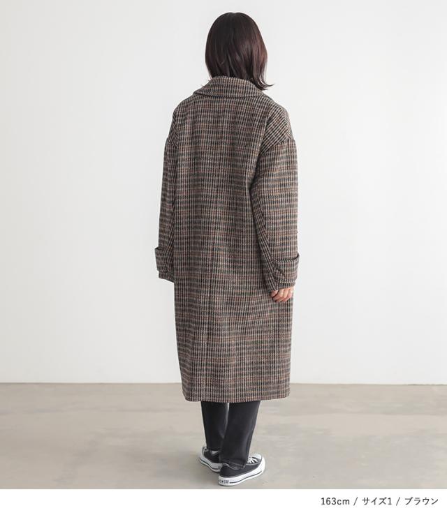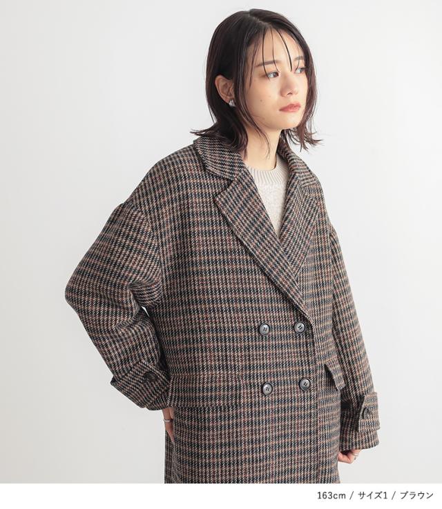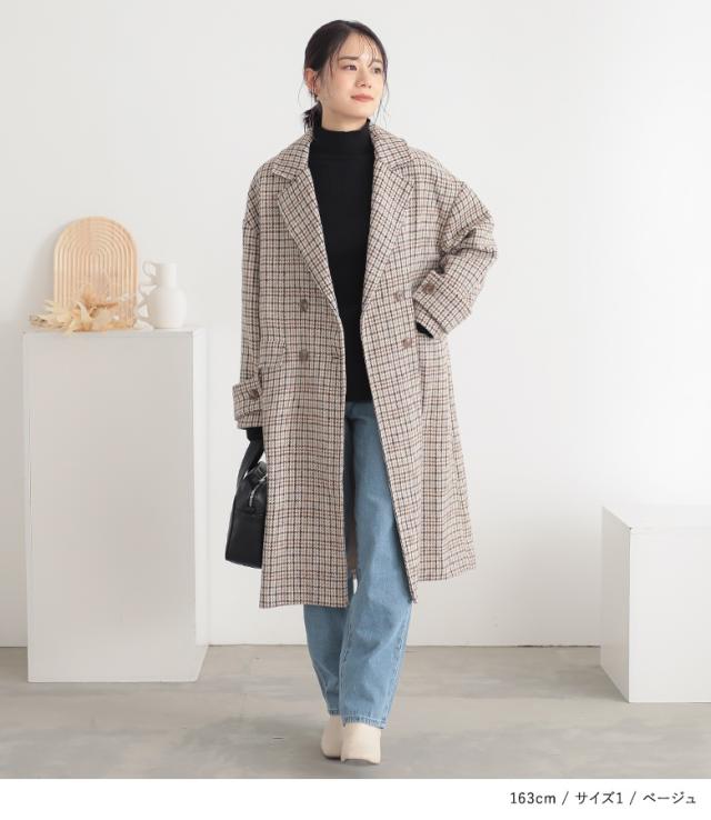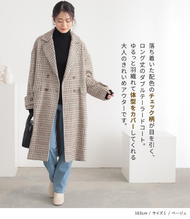 【送料無料】『チェック柄ダブルテーラードコート』【メール便不可】【50】[テーラードコート レディース アウター ロングコート ダブルテーラード チェック柄 裏地付き 長袖 オーバーサイズ 体型カバー 微起毛]