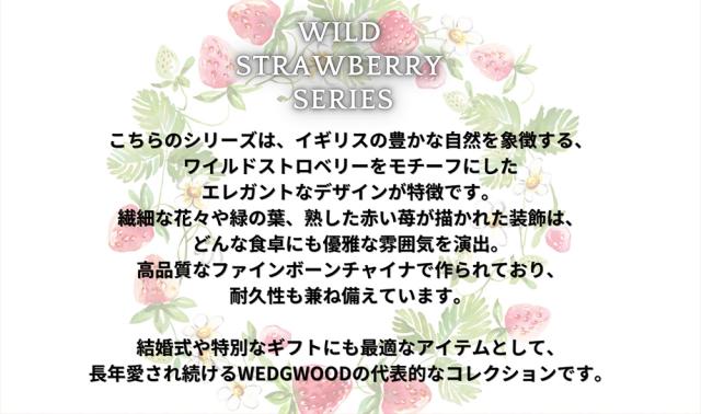 こちらのシリーズは、イギリスの豊かな自然を象徴する、ワイルドストロベリーをモチーフにしたエレガントなデザインが特徴です。繊細な花々や緑の葉、熟した赤い苺が描かれた装飾は、どんな食卓にも優雅な雰囲気を演出。高品質なファインボーンチャイナで作られており、耐久性も兼ね備えています。