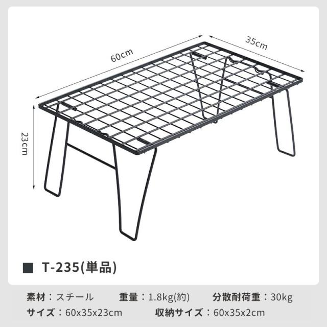 | 特徴 | 別売りの天板を追加することで、簡単にテーブルへ変身!重ねて使えば便利な物置き棚になります 薄くて頑丈 天枠を薄くしたものの、T-230と同様な太い針金の使用より頑丈さは変わらず、ドリンクがたくさん入るクーラーボックスを置くことも可能な耐荷重仕様。黒メッキで重厚な仕上がりです。 組立ては引っ掛けるだけ! 脚の爪を天板フレームに引っ掛ける構造は簡単です。指を挟めづらい対策を施しているので、T-230より、組立時に力がかからないので簡単です。 ギアを引っ掛けられる 短辺と長辺の片側にはジェラカップなどをかけられる隙間があります。他にも、サイドストレージボックスやタクティカルシートを装着可能です。 竹天板T-2301併用 専用のテーブル用天板を購入すれば、ローテーブルに変身。テーブルとして十分な広さ。 ※天枠よりも竹天板の厚みがあるので、木口が見える設置になります。 IGTブリッジテーブル併用 別売りのブリッジテーブルやIGT天板をフィールドラックに連結させ、IGTキッチンシステムに変身。※天枠より天板の厚みがある場合、天枠フレームの上に載せる感じになります。 充実な拡張パーツ併用 拡張パーツが充実しており、別売のコーナー天板を使用することで囲炉裏テーブルとしても利用可能ですので、スタイルに応じて自由にレイアウトできます。 |