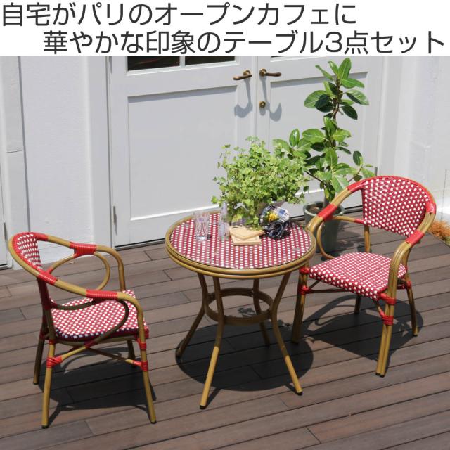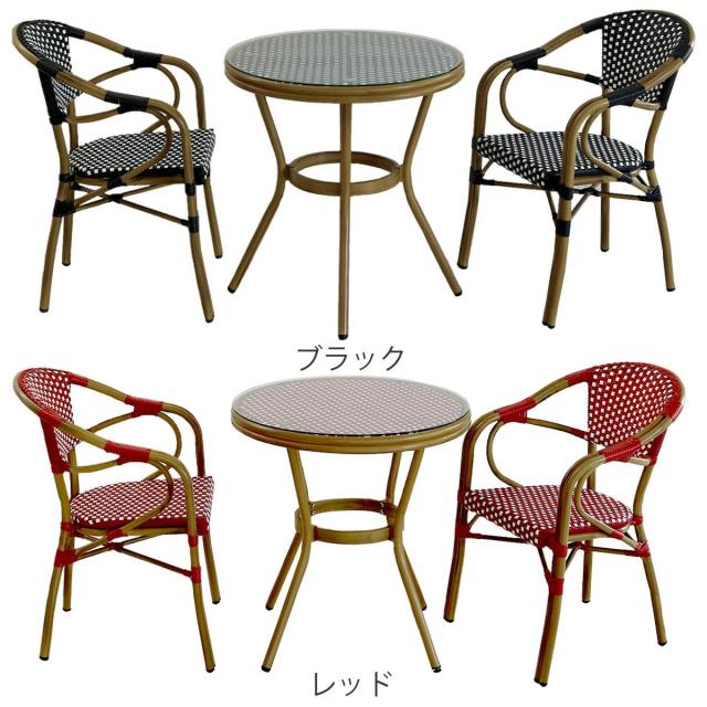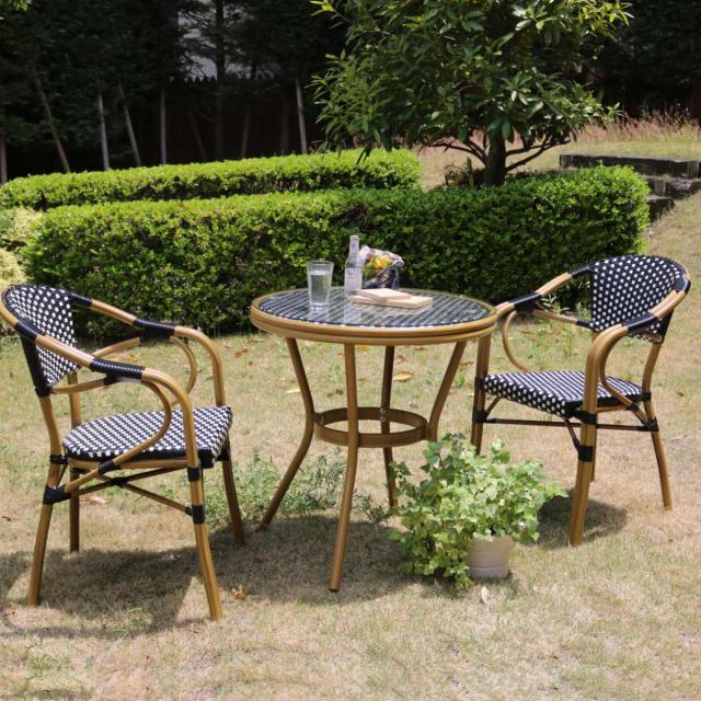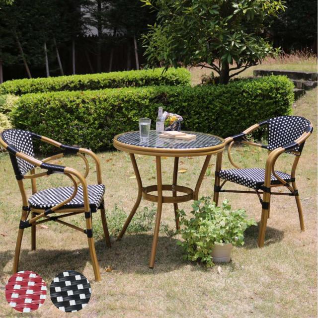 テーブル 3点セット プレジール ラウンド ( ガーデンテーブル ガーデン 庭 丸型 机 ガラス天板 ガラス 強化ガラス チェア セット モダン アンティーク調 バルコニー アジャスター ラタン風 )