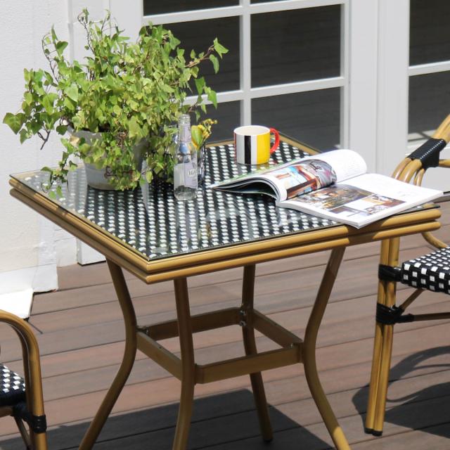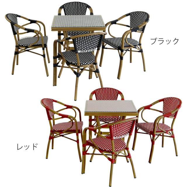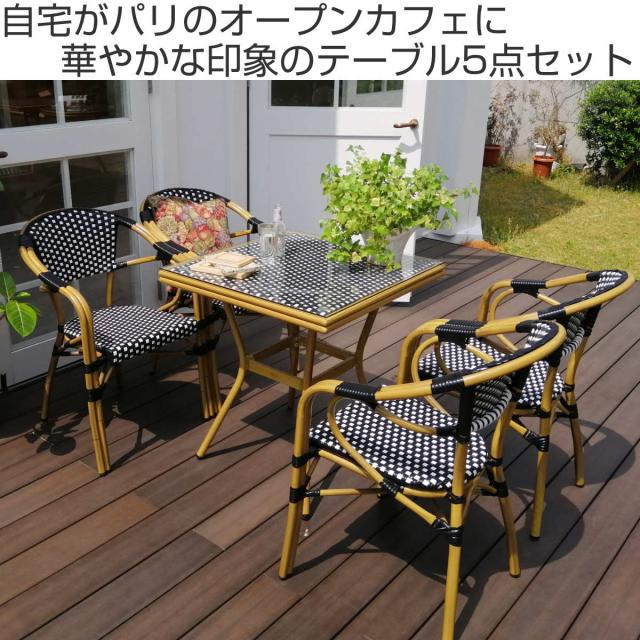 テーブル 5点セット プレジール スクエア ( ガーデンテーブル ガーデン 庭 四角 長方形 机 ガラス天板 ガラス 強化ガラス カフェ チェア セット モダン アンティーク調 バルコニー アジャスター ラタン風 )