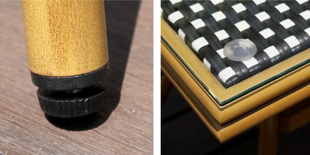 | アジャスター付のテーブル テーブルの脚は、ガタつきを調整できるアジャスターが付いています。 | 安心の強化ガラス天板 強化ガラス天板を使用し、吸盤で固定されているので、お食事も快適です。 |