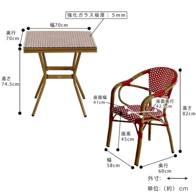 | サイズ | テーブル:約 幅70×奥行70×高さ74.5(cm) チェア:幅58×奥行60×高さ82(cm)/座面高:45(cm) |