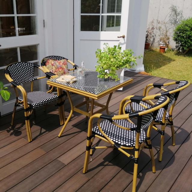 お手入れ簡単な人工ラタンを使用しています。本物のラタンに比べて水はけが良く、丈夫で長持ちしやすい特徴があります。テラス席に置きっぱなしでも華やかさを保つことができます。
