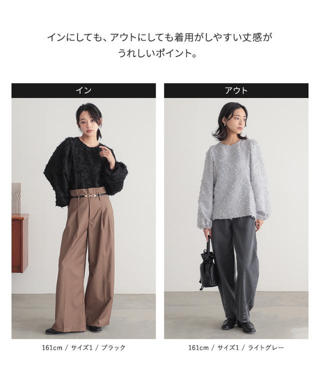 | staff:C/158cm B87 W70.5 H92.5 【普段着用】 Tops: M Bottoms: M | 【1】 袖丈:手首位 着丈:ヒップ真ん中位 腕周り:ゆったり バスト:ややゆったり 全体:ややゆったり 袖はかなりゆとりがありますが、その他は程よいゆとりで着られました。 【2】 袖丈:指の真ん中位 着丈:ヒップ下少し見える位 腕周り:大きい バスト:ゆったり 全体:ゆったり 全体的にゆったり着られました。 私の場合は、1を選びます。 |