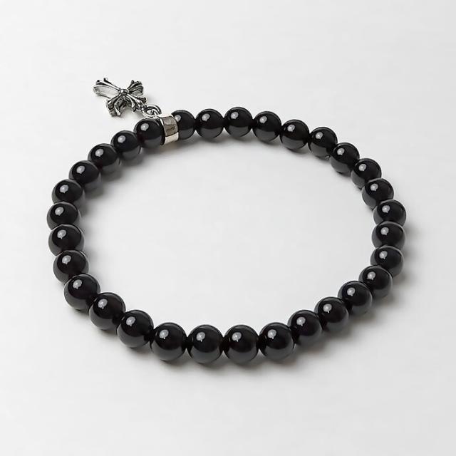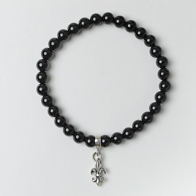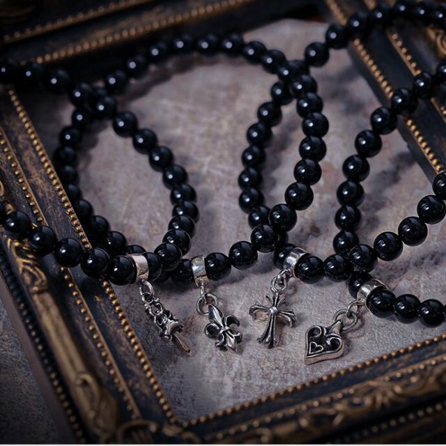 ブラックオニキスの艶やかな質感に、クロス(十字架)・ダガー・リリーフレア(百合)・ハートといったゴシックテイストのシルバーチャームを組み合わせ、無骨さと上品さを兼ね備えたデザインに仕上げています。