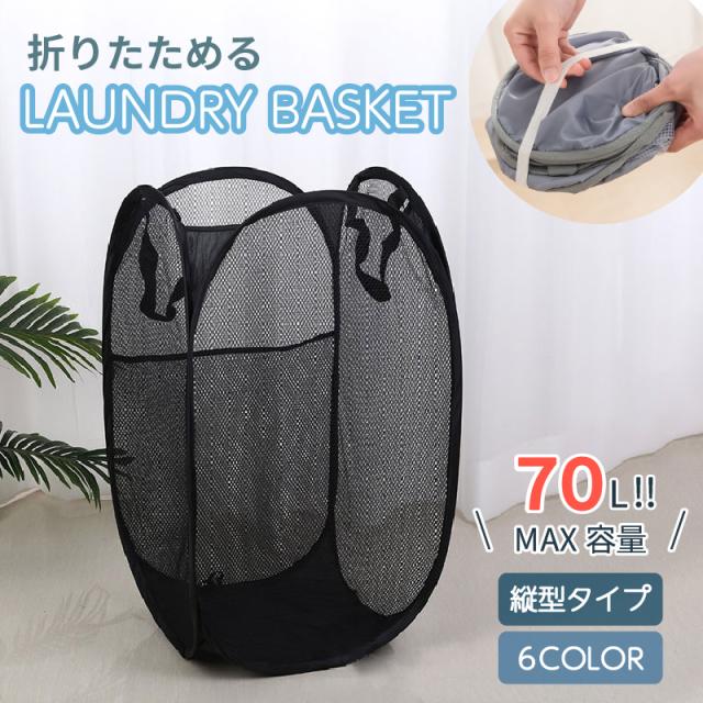 ランドリーバスケット 縦型 折りたたみ スリム 大容量 洗濯かご 洗濯カゴ ランドリーバッグ 折り畳み コンパクト 軽量 省スペース 収納 軽い 持ち運び 抗菌 防カビ メッシュ おしゃれ 洗濯物入れ 70L