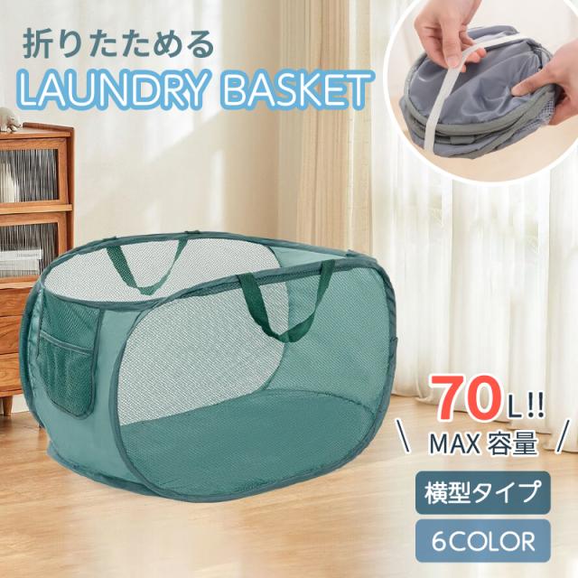 ランドリーバスケット 横型 折りたたみ スリム 大容量 洗濯かご 洗濯カゴ ランドリーバッグ 折り畳み コンパクト 軽量 省スペース 収納 軽い 持ち運び 抗菌 防カビ メッシュ おしゃれ 洗濯物入れ 70L