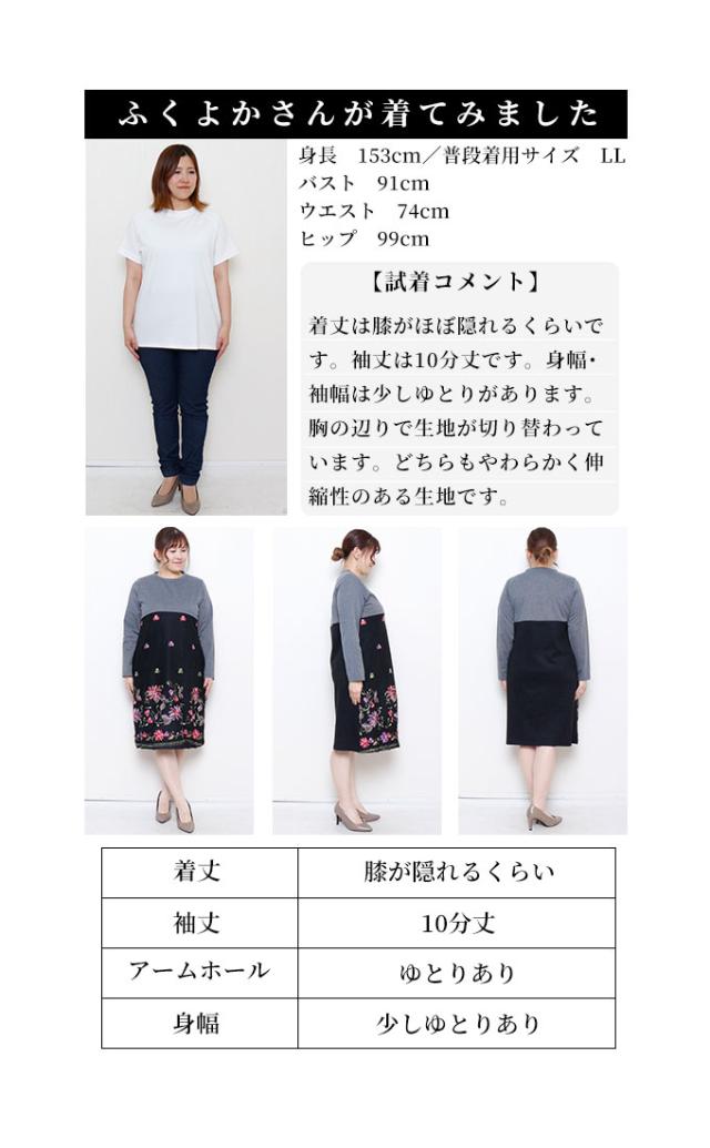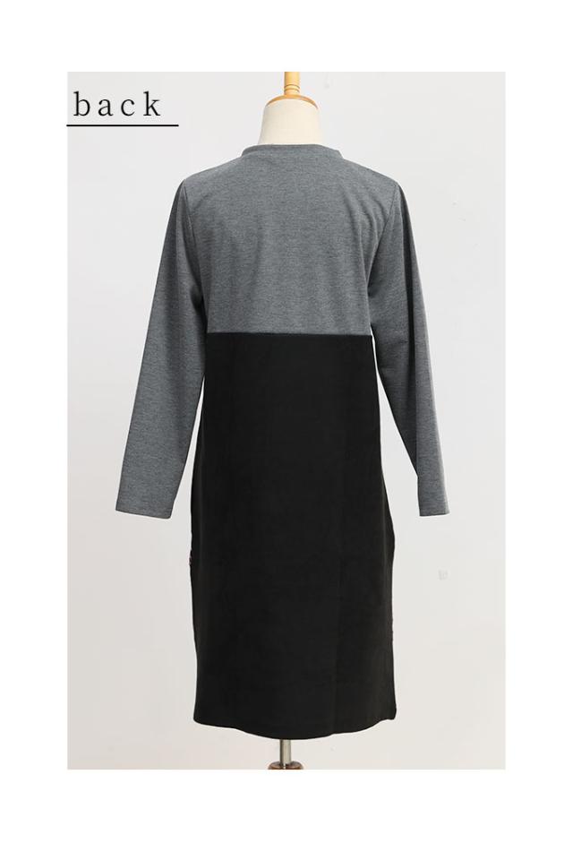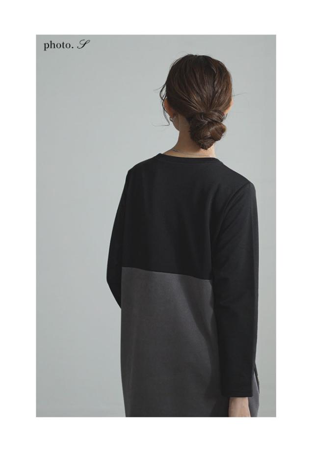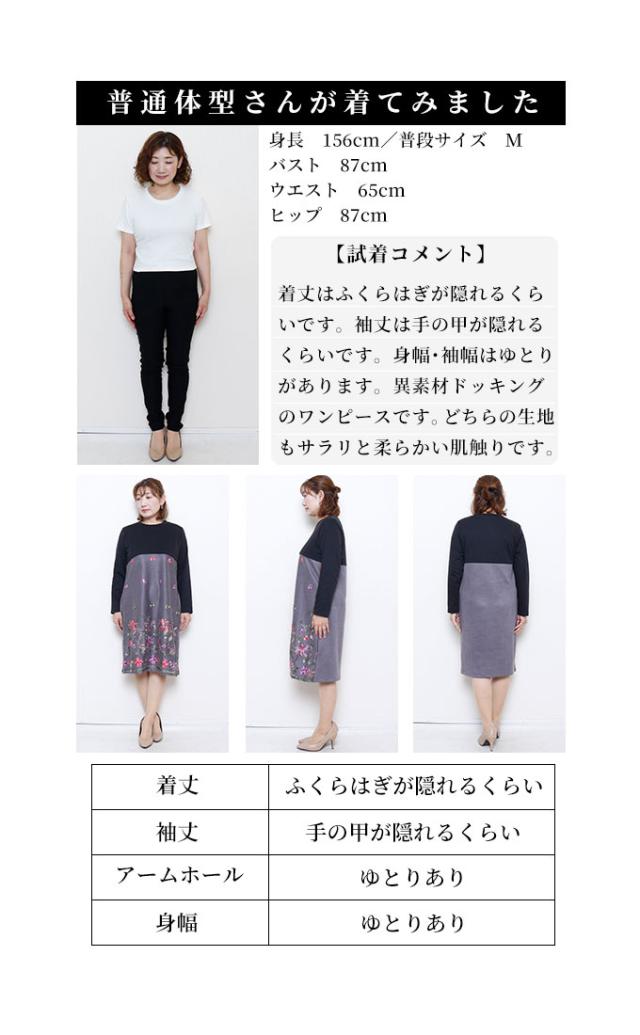 着丈はふくらはぎが隠れるくらいです。袖丈は手の甲が隠れるくらいです。身幅・袖幅はゆとりがあります。異素材ドッキングのワンピースです。どちらの生地もサラリと柔らかい肌触りです。ニット地には伸縮性があります。程よい開きのVネックがスッキリとした印象で素敵です。