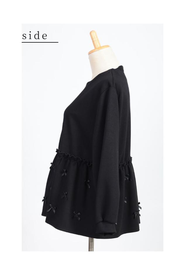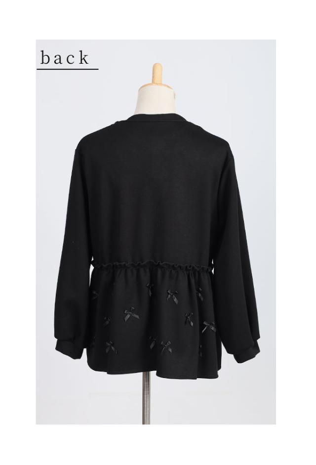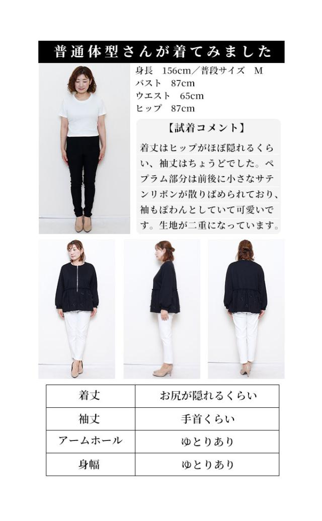 着丈はヒップがほぼ隠れるくらい、袖丈はちょうどでした。柔らかで滑らかな肌触りのカットソー生地で、ややハイウエスト位置からのペプラム切り替えでお腹からヒップ周りが気になりません。ペプラム部分は前後に小さなサテンリボンが散りばめられており、袖もぽわんとしていて可愛いです。首元は少し鎖骨がのぞくくらいのラウンドネックでフロントファスナー開きです。ペプラム部分は生地が二重になっています。