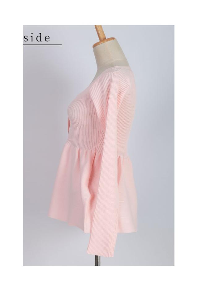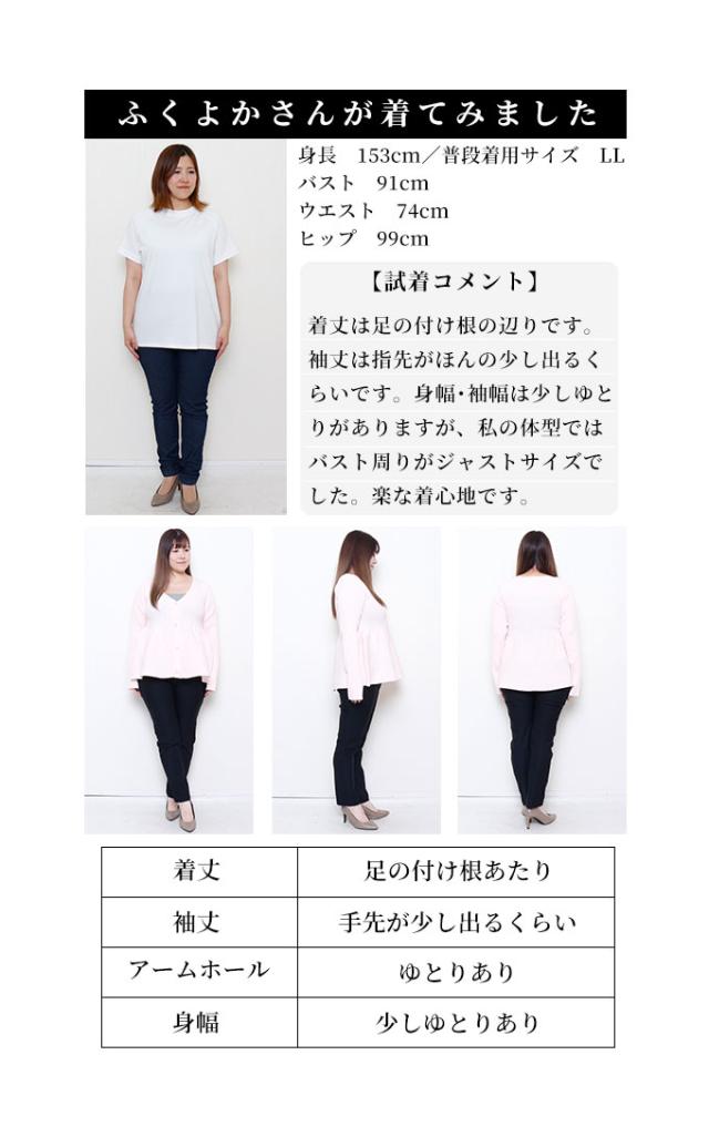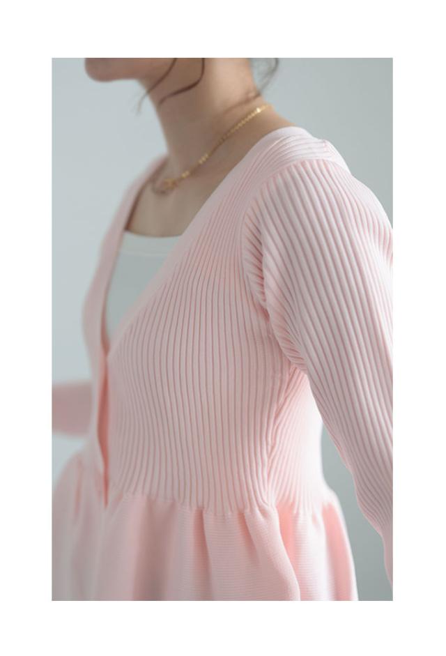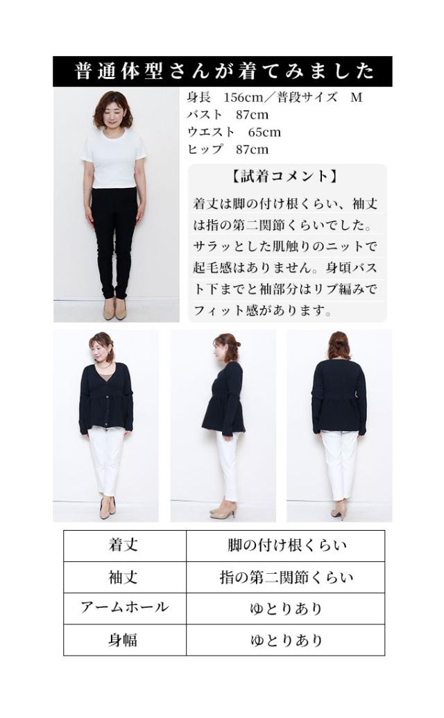 着丈は脚の付け根くらい、袖丈は指の第二関節くらいでした。サラッとした肌触りのニットで起毛感はありません。身頃バスト下までと袖部分はリブ編みでフィット感があり、バスト下からはペプラム風に広がるシルエットです。首元はバストトップ位置くらいの深めのVネックなのでインナーが必要です。