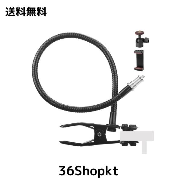 ??【商品仕様&ご注意】「商品スペック」?カメラアームスタンド:素材ー鋼鉄製 、アーム長さ:63?まで、挟める範囲:約5cmまで;?スマホクリップ:素材:プラスチック+PVC+金属、挟める範囲:58〜90?; ?自由雲台:素材:金属+プラスチック+ゴム、取り付けネジ:UNC1/4;「パッケージ内容」アームスタンド*1 自由雲台*1 スマホクリップ*1 クッションゴム*1「ご注意」?撮影設備は転落や傷つきしないように、設置した設備を支えながらアームを曲げて角度や高さを調節してください;?製品の品質や使用方法にはご不明な点がございましたらお問い合わせいただければ幸いです。