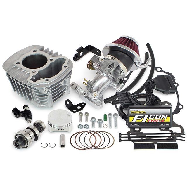 ハイパーSステージボアアップキットは、SステージボアアップキットにFIコン TYPE-X(インジェクションコントローラー)、ビッグスロットルボディーキット、大容量インジェクターが付属しています。