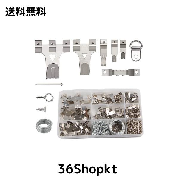 お得な282点額受・ピクチャーハンガーセット:3爪フック4つ、最大耐荷重75lbs(34kg)。2爪フック8つ、最大荷重40lbs(18kg)。大きな1爪フック10つ、最大荷重30lbs(14kg)。中型の1爪フック15つ、最大荷重20lbs(9kg)。小さな1爪フック25つ、最大荷重10lbs(4kg)。のこぎり歯30つ。Dリング10つ。スクリューリング10つ。ネジ70つ。釘99つ。ワイヤロープ3メートル。