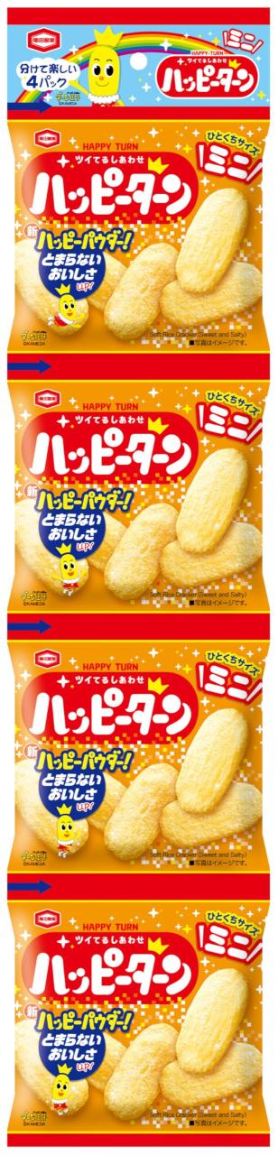 説明 商品紹介 可愛いひとくちサイズのハッピーターンミニです。 パッケージが可愛い、楽しい4連パックです。 お子様のおやつに最適です。 昔も今も変わらぬ味わいの亀田製菓の商品です。 本社は米どころ新潟県新潟市にございます。 お子様のおやつや大人のお茶菓子等多種多様なシーンでご活躍できるおせんべいですので是非お召し上がりください。 原材料・成分 原材料:米(うるち米(米国産、国産)、もち米(タイ産))、植物油脂、でん粉、砂糖、たんぱく加水分解物(大豆を含む)、食塩、デキストリン、加工でん粉、調味料(アミノ酸)、植物レシチン(大豆由来)