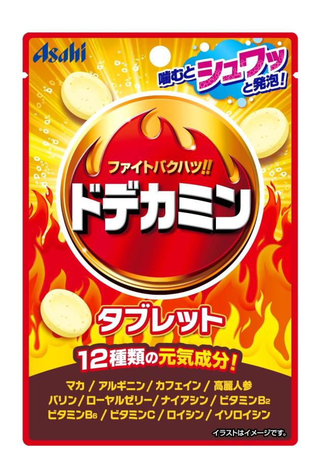 説明 商品紹介 ●エナジー炭酸飲料「ドデカミン」をイメージし、エナジードリンク風味に仕立てた、発泡感のあるタブレットです。●12種類の元気成分入り。(マカ、アルギニン、カフェイン、高麗人参、バリン、ローヤルゼリー、ナイアシン、ビタミンB2、ビタミンB6、ビタミンC、ロイシン、イソロイシン)●噛むと爽快な発泡感が楽しめるので、元気を出したい時やリフレッシュしたい時にピッタリです。●「ドデカミンブランドロゴ」を中心としたインパクトがあり元気が出るデザイン。 原材料・成分 砂糖(国内製造)、水飴、ローヤルゼリーパウダー、マカエキスパウダー、高麗人参エキスパウダー/酸味料、重曹、ショ糖エステル、甘味料(アスパルテーム・L-フェニルアラニン化合物)、香料、着色料(紅花黄、アントシアニン、カロテノイド)、V.C、アルギニン、糊料(グァー)、カフェイン、ナイアシン、ロイシン、V.B6、イソロイシン、バリン、V.B2、(一部に乳成分を含む)