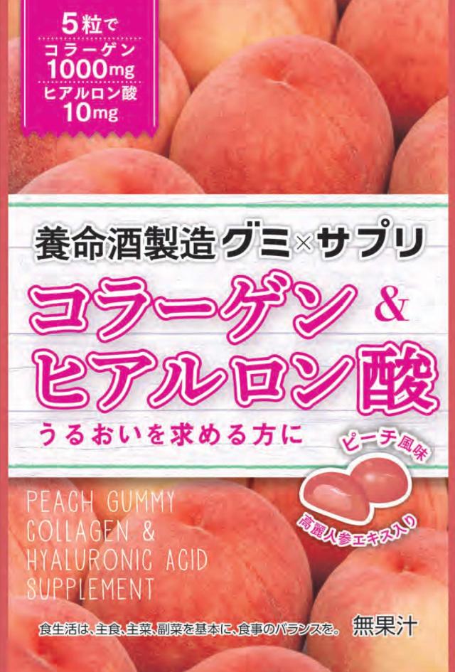 原材料:水あめ(国内製造)、砂糖、ゼラチン、粉末オブラート、ピーチ濃縮果汁、コラーゲンペプチド、杜仲茶エキス、高麗人参エキス/ソルビトール、酸味料、ゲル化剤(ペクチン)、香料、光沢剤、ヒアルロン酸、乳化剤、アカダイコン色素