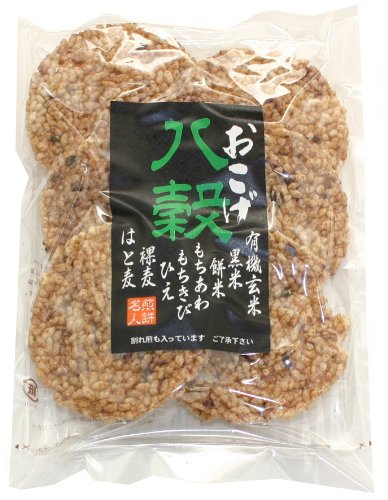 原材料:うるち米(国内産)、米油、有機玄米(国内産)、醤油、餅米(国内産)、黒米(国内産)、砂糖、裸麦、はと麦、もちきび、もち粟、ひえ、たまり醤油、みりん、昆布、鰹削り節(原材料の一部に大豆、小麦を含む)