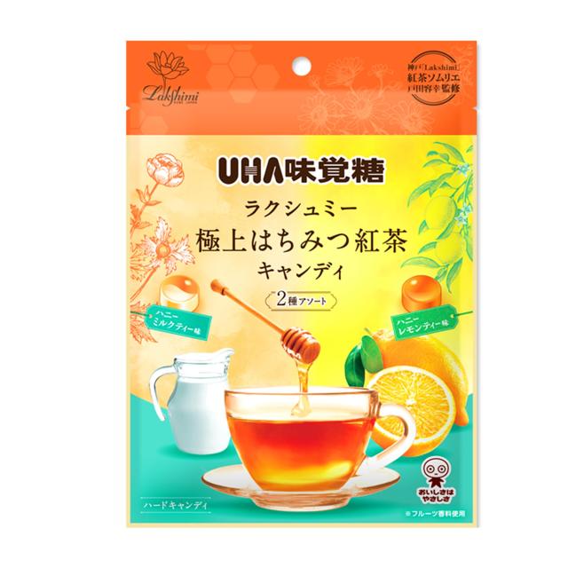 説明 商品紹介 紅茶ソムリエ戸田容幸氏監修。紅茶専門店ラクシュミーの看板商品「極上はちみつ紅茶」とのコラボキャンディです。紅茶とはちみつの上品な味わいをリアルに再現。ハニーミルクティー味とハニーレモンティー味の2種アソートです。 原材料・成分 【ハニーミルクティー】砂糖(国内製造)、水飴、粉乳、はちみつ、加糖練乳、植物油脂、紅茶、生クリーム、はちみつパウダー、食塩/香料、乳化剤、調味料(無機塩)、酸味料、塩化マグネシウム、甘味料(アスパルテーム・L‐フェニルアラニン化合物)、(一部に乳成分・大豆を含む)【ハニーレモンティ—】砂糖(国内製造)、水飴、はちみつ、紅茶、はちみつパウダー/酸味料、香料、甘味料(アスパルテーム・L‐フェニルアラニン化合物)