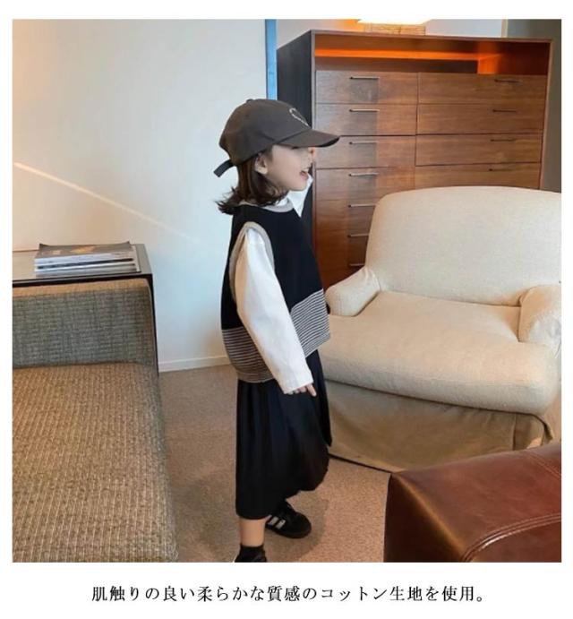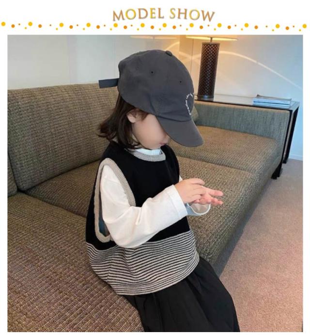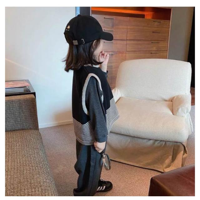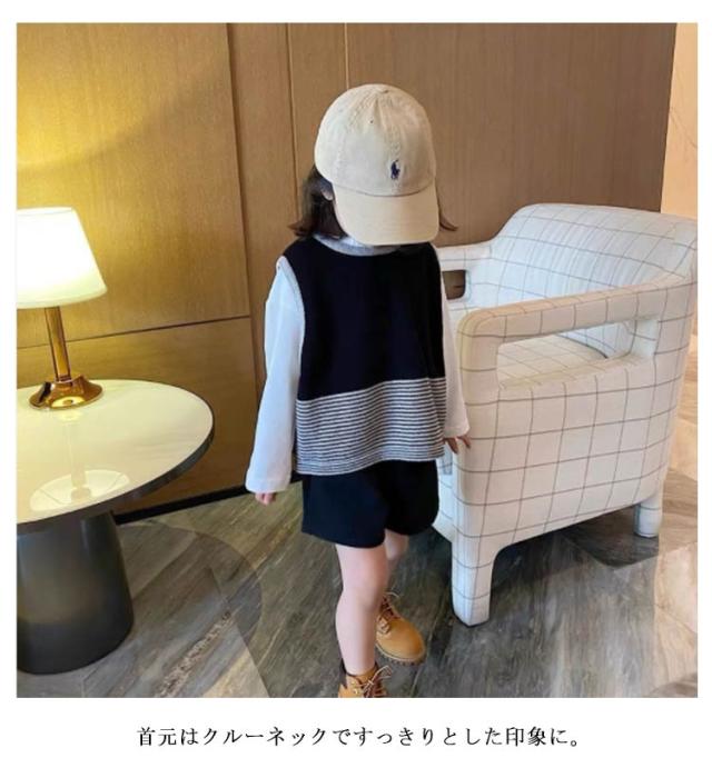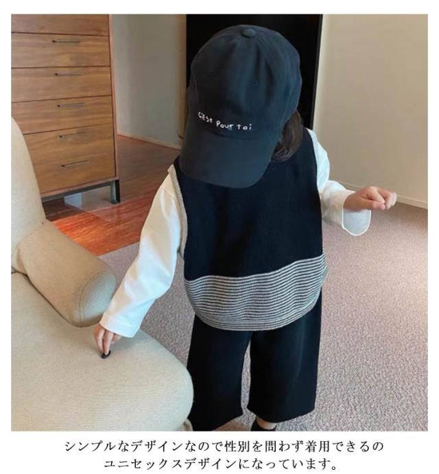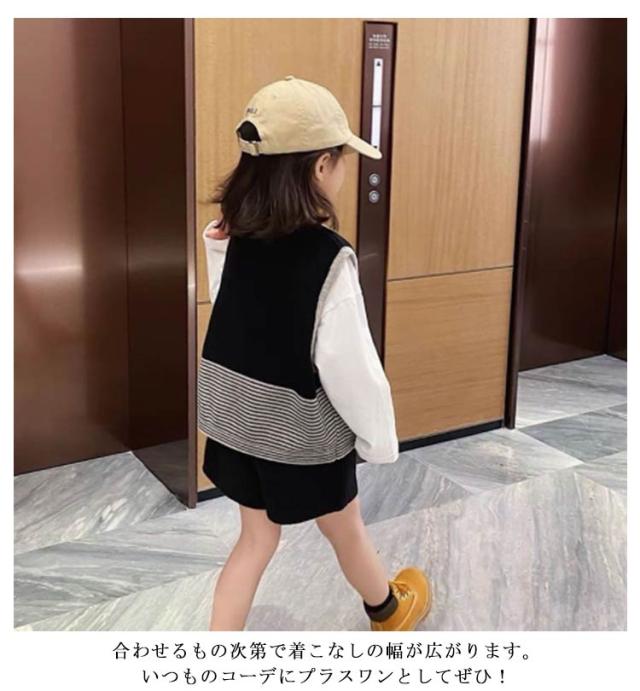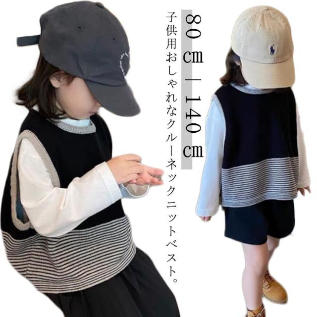 ベスト キッズ 子供服 ニットベスト クルーネック プルオーバー ボーダー柄 ベビー服 赤ちゃん 女の子 男の子 秋 冬 ニットトップス パイピング 可愛い おしゃれ 韓国 通学 通園 暖かい 防寒 保温 80 90 100 110 120 130 140 黒 ブラック 【送無】