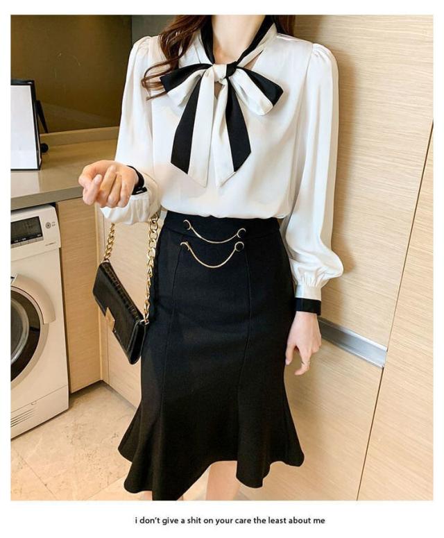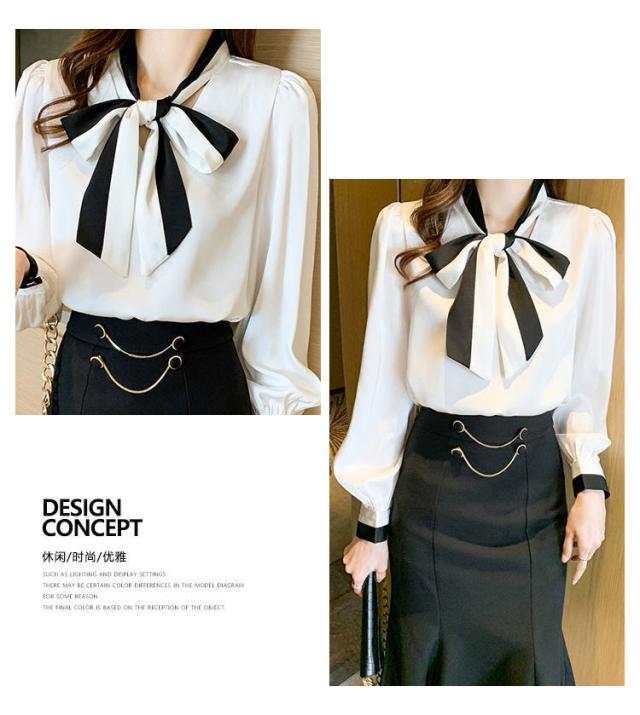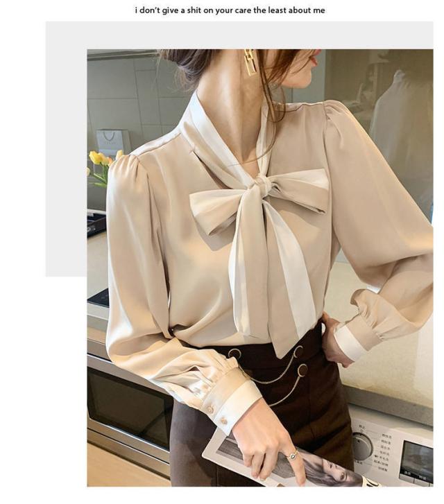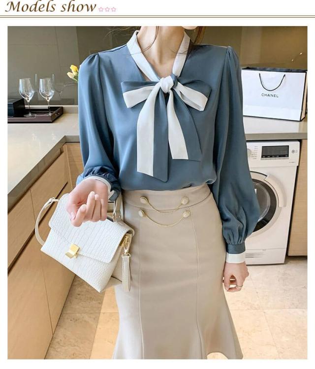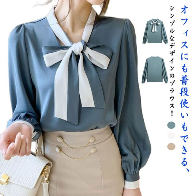 バイカラーボウタイ シャツ シフォンブラウス ボウタイ 長袖 大きいサイズ OL リボン付き 女性 ボウタイ ボウタイシャツ トップス ブラウン 大人 きれいめ 無地 通勤 ビジネス 着?せ シャツブラウス 上品 ギフト