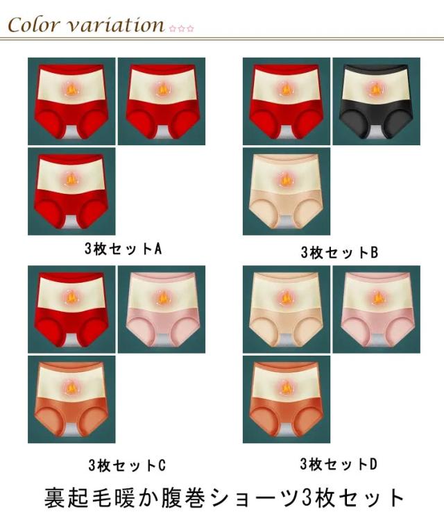 | 裏起毛暖か腹巻ショーツ3枚セット 秋冬の寒い季節に最適!下半身をあたためて体の内側からぽかぽか。 伸縮性抜群で無理のない心地よさで程よいフィット感、腹巻とショーツが一体型になってしっかりお腹まで温めてくれるショーツ。 ふわもち裏起毛の心地よい肌触りでまるで毛布に包まれている様な温かさ。 抗菌クロッチで温かさだけでなくショーツとしても優秀なアイテムです。 あたたかいパンツで体温を下げないようにして、厳しい寒さを乗り越えましょう♪ | |