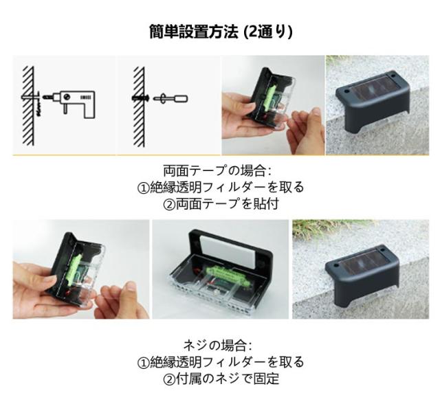 | 電源不要・防水・貼り付け ソーラーライト ライト3色×カバー3色選べる 4個セット 【商品説明】 ☆ 玄関 階段 庭 などの 屋外 用の LED ソーラーライト ソーラー 充電 夜に 自動点灯 ☆ 防犯対策 足元灯 ガーデンライト として コンパクト なのに 明るい 安心 ☆ おしゃれ な見た目 かっこいい 外構 取付簡単 すぐ使える ♪ ☆ 防水 型 LEDライト 店舗 テラス 装飾 にも !! <お勧めポイント> 【ポイント01】 自動充電/点灯モード スイッチなしなので超シンプル 昼:自動充電モード 充電:約8時間 夜:自動点灯モード 点灯:最長約8時間 ※太陽の充電時間により異なります。 【ポイント02】 屋外用には防水性は重要! 屋外には安心の防水性 強い雨風や台風にも対応 【ポイント03】 多彩な使い方 玄関や庭以外にも使い方はさまざま サイズもコンパクトで持ちやすい 【ポイント04】 簡単設置方法 (2通り) 両面テープの場合: 1.絶縁透明フィルダーを取る 2.両面テープを貼付 ネジの場合: 1.絶縁透明フィルダーを取る 2.付属のネジで固定 | |