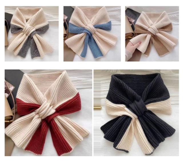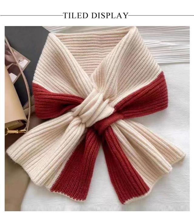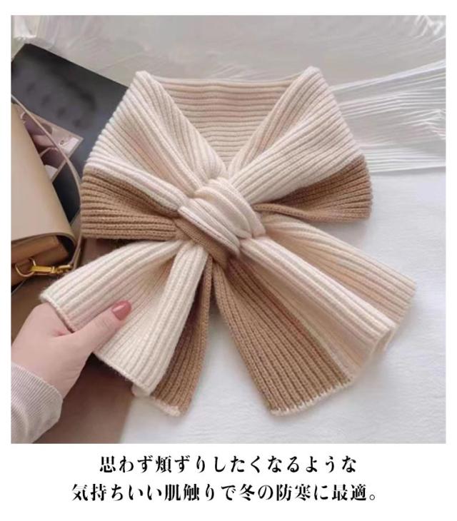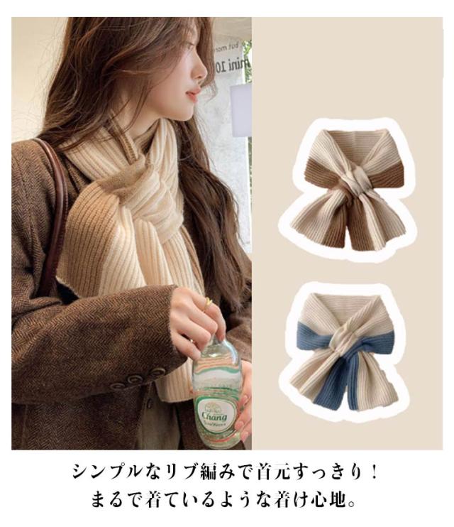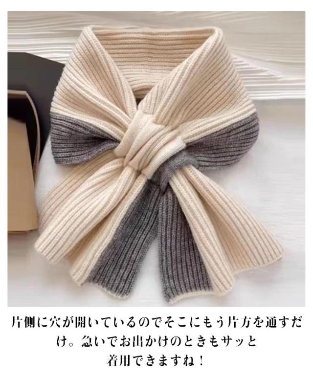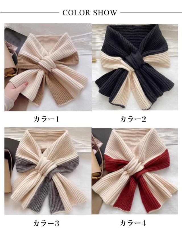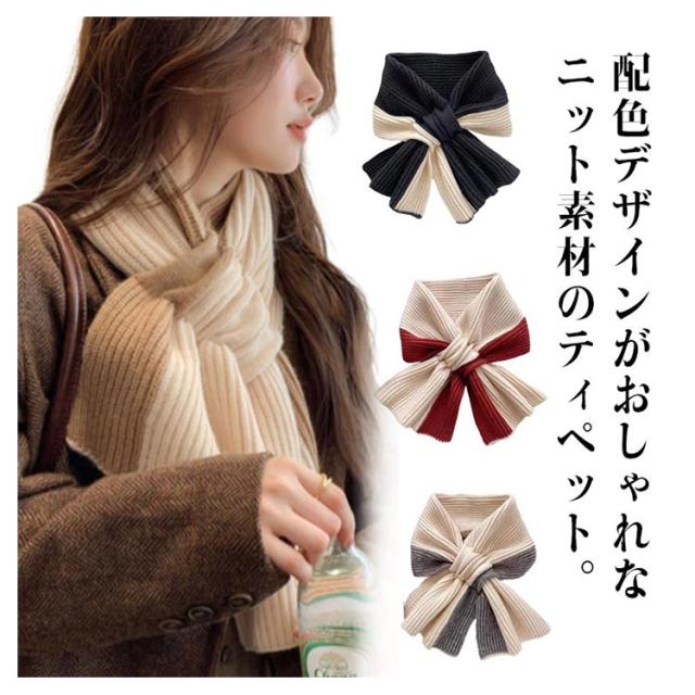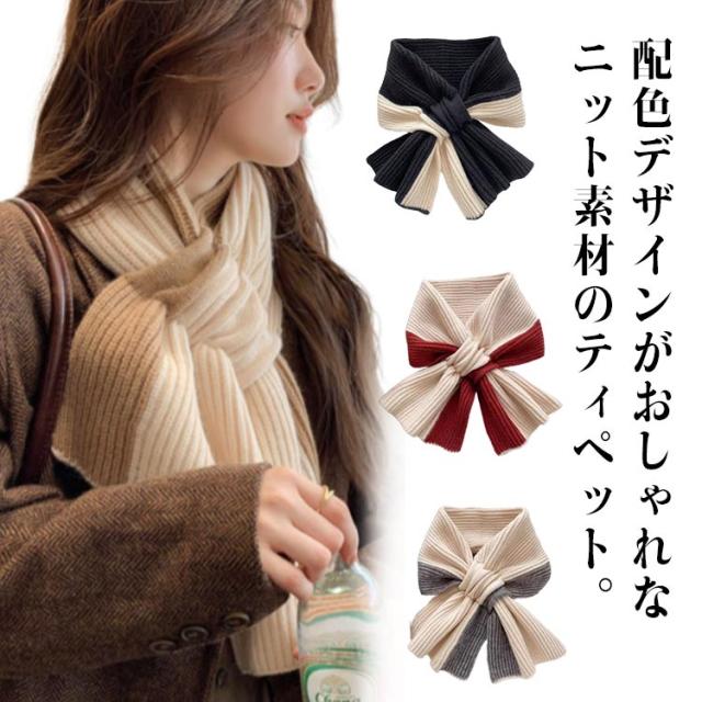 ニットティペット マフラー レディース メンズ ストール ティペット ミニ バイカラー 配色 リブニット 差し込み 通すだけ ミニマフラー 簡単 リボン 大人 可愛い ネックウォーマー 送料無料 ベージュ ブラック グレー レッド ブルー