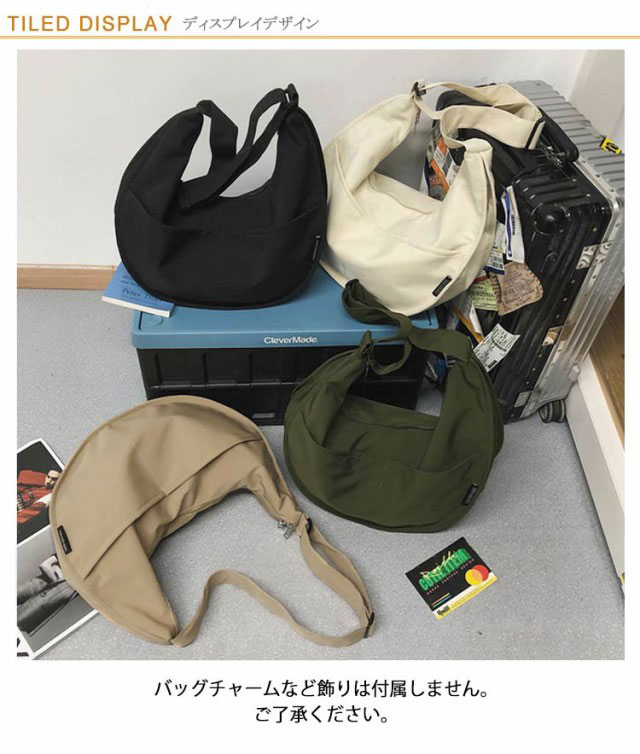 | マチ広の大容量月型ショルダーバッグ。 体にフィットする月のシルエットがトレンドライクでおしゃれ。 斜め掛けもできるので両手が解放されて、荷物の多い時や子連れの時は楽々。 大きな2つ外ポケット付きで、スマホなどさっと出し入れやすいのが嬉しいポイント。 ショルダーの長さ調節が可能なので、斜め掛けも肩掛けも◎ A4ファイルや500mlペットボトルもしっかり入る大容量サイズ! 通勤通学用バッグ、スポーツバッグ、サブバッグなどマルチ使いにオススメ。 バッグチャームなど飾りは付属しません。ご了承ください。 | |