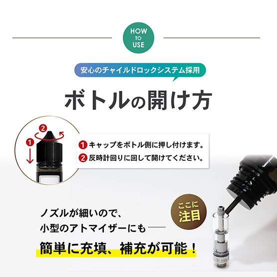 | 成分 | プロピレングリコール,植物性グリセリン,香料 ニコチン 0mg タール・有害物質なし |