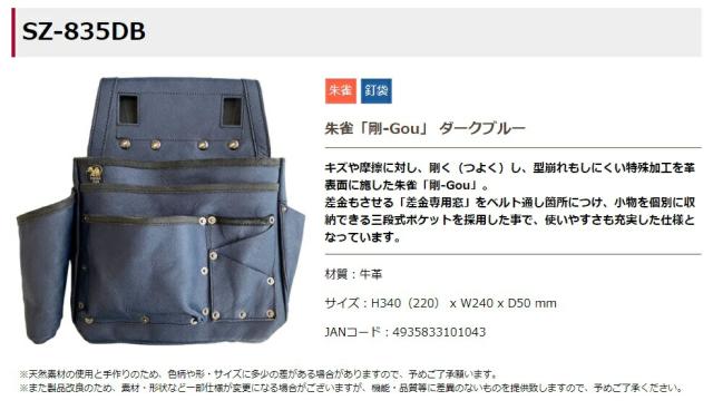 ふくろ倶楽部 朱雀 「剛-Gou」ダークブルー SZ-835DB 材質:牛革 釘袋 腰袋 H340(220)xW240xD50mm 101043 在庫