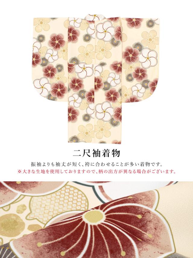 ※着物の柄部分は大きな生地を使用して作られておりますので、色や柄の出方、模様の配置等が画像と異なる場合がございます。