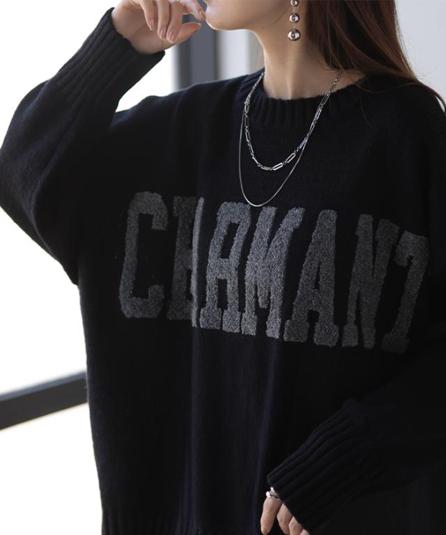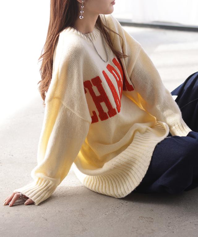 ニット ロゴ 刺繍 チュニック ロング トップス セーター オーバーサイズ 長袖 ドルマン ロゴニット オーバー リブ クルーネック ドロップショルダー ざっくり プルオーバー 長い チクチクしない 大きいサイズ 体型カバー カジュアル 黒 秋 冬 HUG.U 秋新作