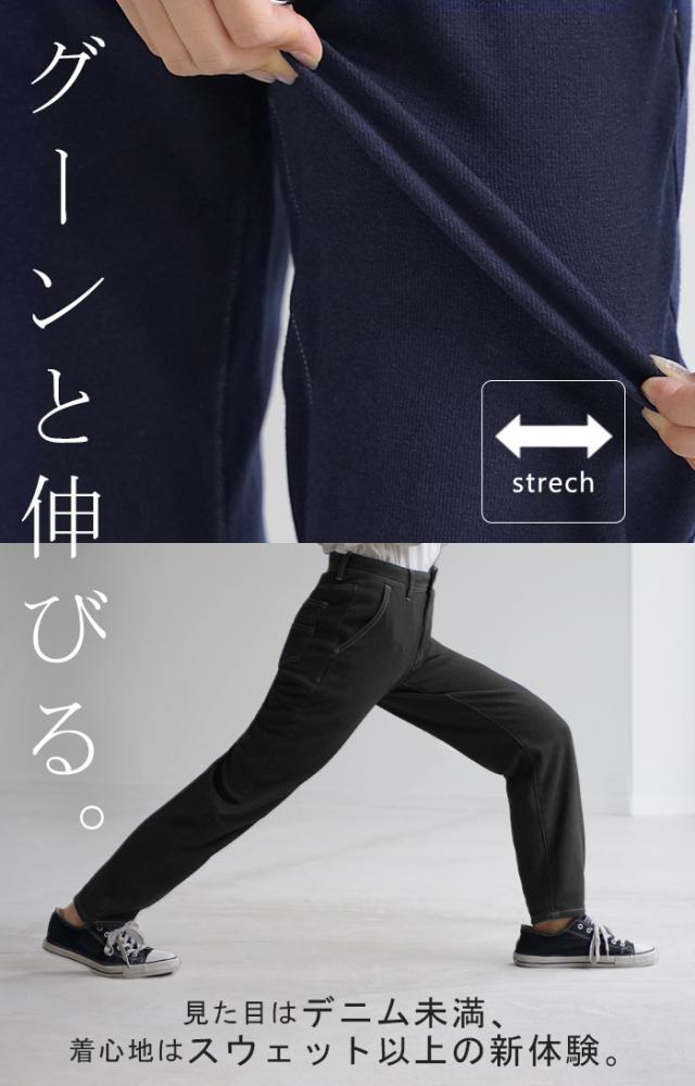 高機能で楽々着用のニットデニムテーパードパンツです。