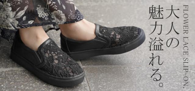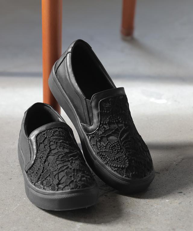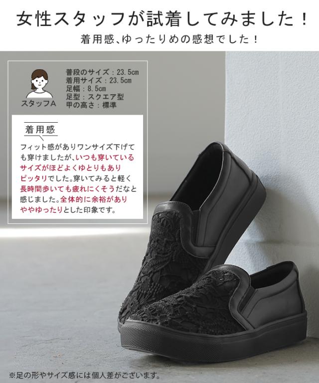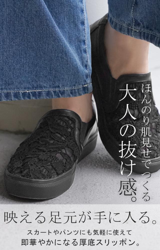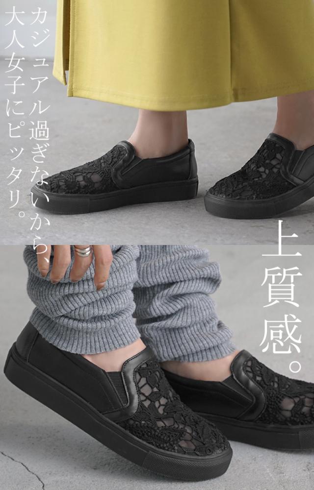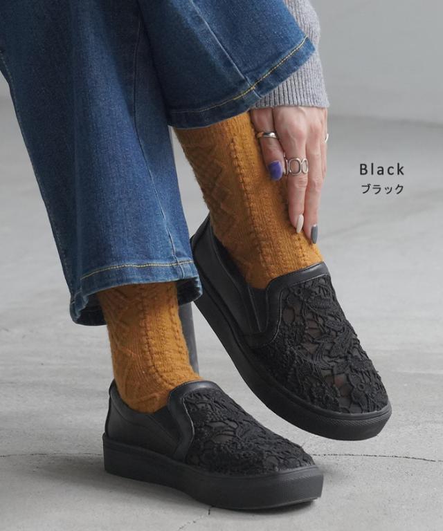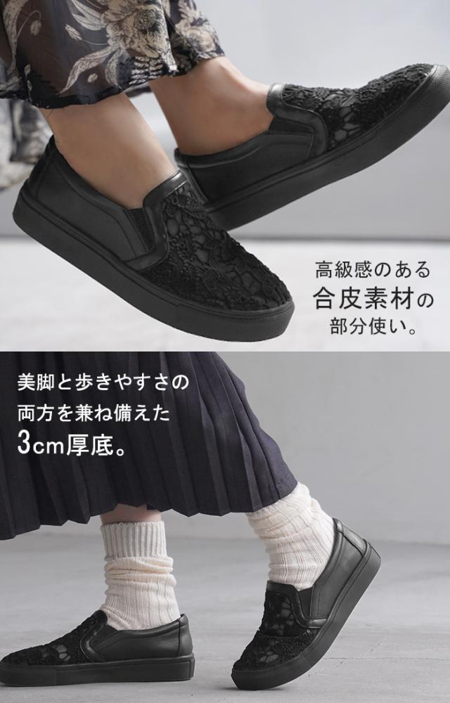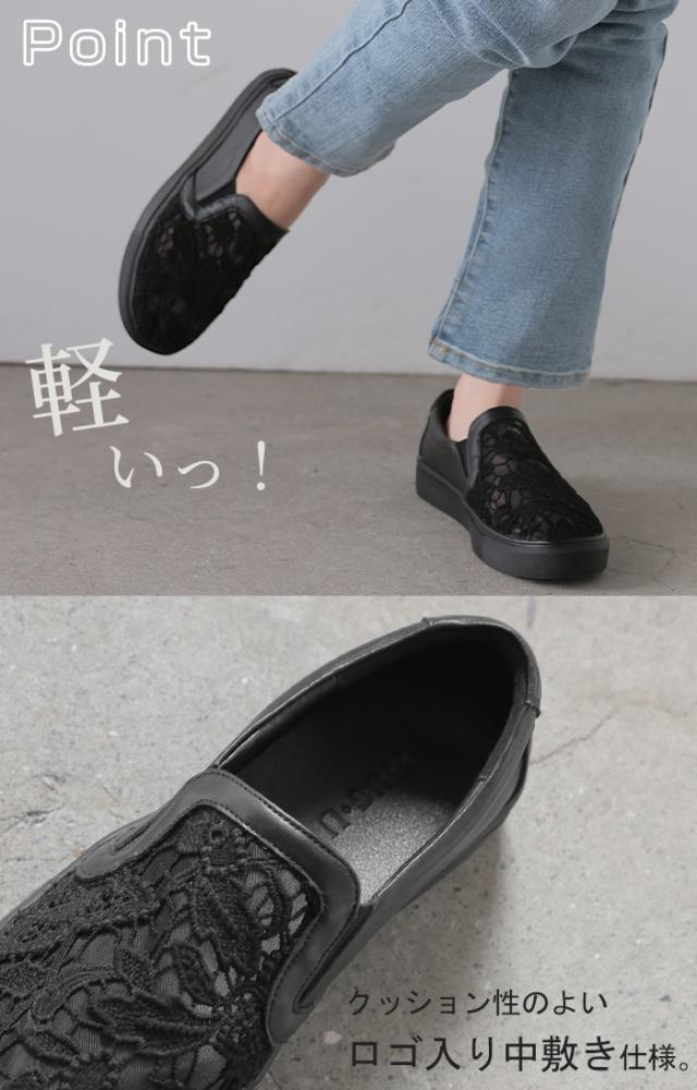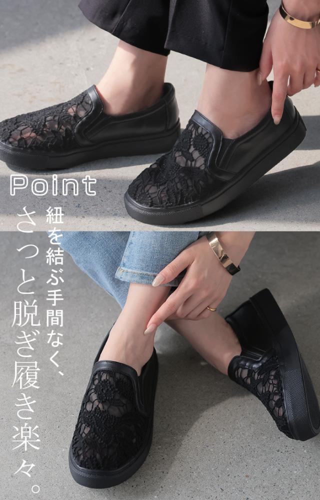 23.0cm 〜 24.5cm スリッポン レース レディース スニーカー 紐なしスニーカー ローカット フラット ぺたんこ 軽量 シューズ 歩きやすい スリッポンスニーカー フラットシューズ インソール 厚底 カジュアル おしゃれ 靴 ブラック 黒 春 夏 HUG.U