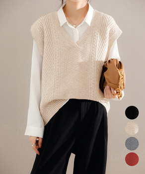ケーブル編みデザインがアクセントになり、シンプルなコーディネートでも存在感を発揮するニットベスト。