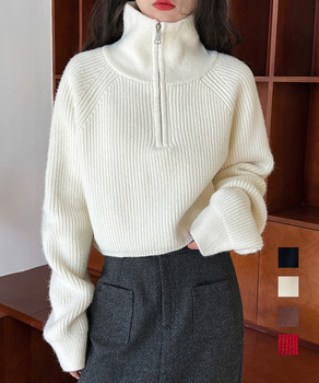 ハーフジップニット 中厚手 大人カジュアル カデットカラー ハイネック 長袖 ニットセーター ZIP 通学通勤 着回し ニットプルオーバー ニットウェア 秋冬