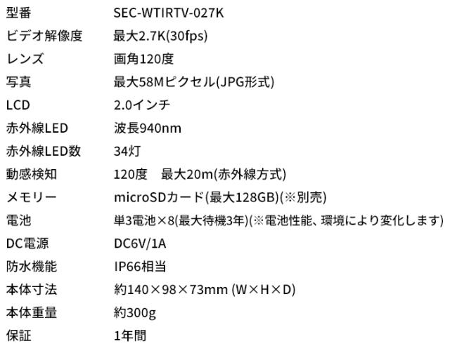 SEC-WTIRTV-027K | 2.7K画質赤外線搭載トレイルカメラ【防犯カメラ】【監視カメラ】【トレイルカメラ】【屋外対応】