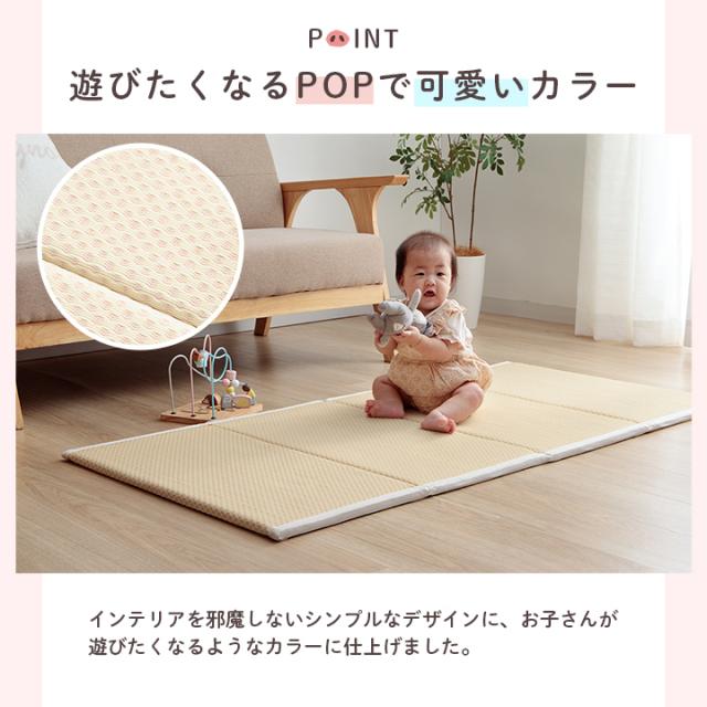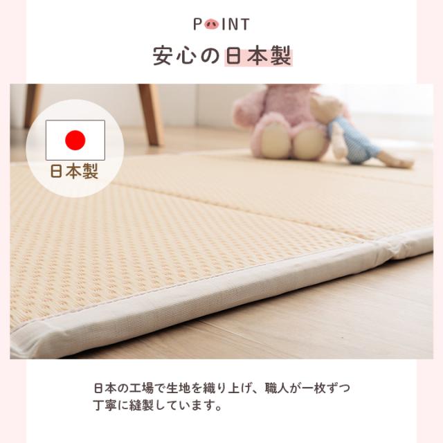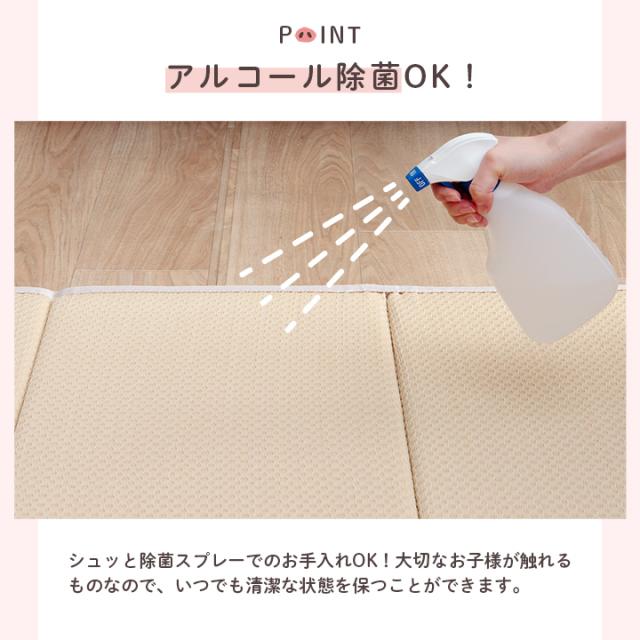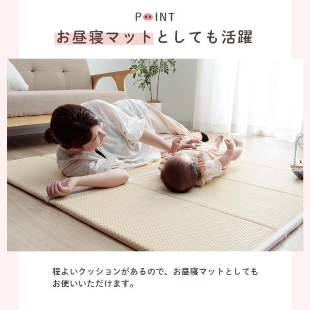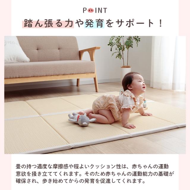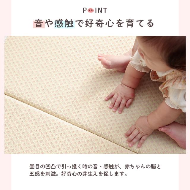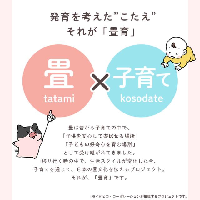| ■ 畳は昔から子育ての中で、「子供を安心して遊ばせる場所」「子供の好奇心を育む場所」として受け継がれてきました。 移り行く時の中で、生活スタイルが変化した今、子育てを通じて、生活スタイルが変化した今、子育てを通じて、日本の畳文化を伝えるプロジェクト。 それが「畳育」です。 ■ 畳の持つ適度な摩擦感や程よいクッション性は、赤ちゃんの運動意欲を掻き立ててくれます。 そのため赤ちゃんの運動能力の基礎が確保され、歩き始めてからの発育を促進してくれます。 ■ 畳目の凹凸で引っ掻く時の音・感触が、赤ちゃんの脳と五感を刺激。好奇心の芽生えを促します。 ■ 程よいクッションがあるので、お昼寝マットとしてもお使いいただけます。 ■ 表地には耐久性に優れているポリプロピレン素材を使用しているので、おもちゃ等を引っ掛けても傷がつきにくい素材です。 また、汚れにも強く、万が一汚れても簡単に拭き取ることができます。 ■ ポリプロピレン素材は、カビが発生しにくい素材のためカビを食すダニも寄り付きにくく、お子様にも安心のやさしい素材です。 ■ シュッと除菌スプレーでのお手入れOK!大切なお子様が触れるものなので、いつでも清潔な状態を保つことができます。 ■ 中材にウレタンを使用しているので、程よいクッション性があり、お子様が転倒しても安心! ■ 折りたためるので使わない際はコンパクトに収納可能。また軽量(約2.2kg)なので持ち運びもらくらくです。 ■ インテリアを邪魔しないシンプルなデザインに、お子さんが遊びたくなるようなカラーに仕上げました。 ■ 日本の工場で生地を織り上げ、職人が一枚ずつ丁寧に縫製しています。 |