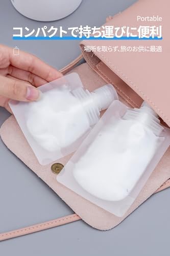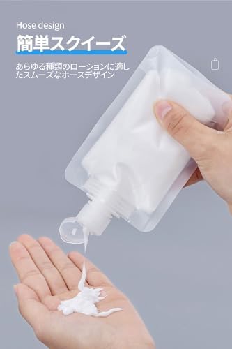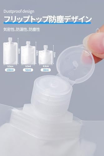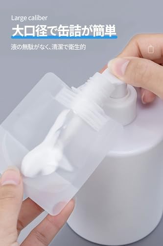 【使いやすく、液漏れしにくい】 個包装のトラベルリキッドパックには、直径1.5cmの注入口があり、簡単に液体を入れることができます。蓋をひねるだけで液体を入れることができます。使い方は、折りたたんだ蓋を開け、小さな穴から好きな量の液体を絞ります。蓋に付いている長いストッパーが液体をしっかり密封するので、液漏れの心配がありません。