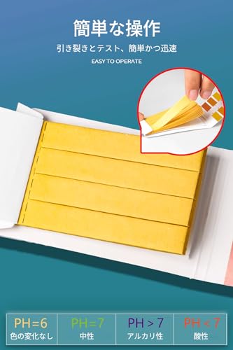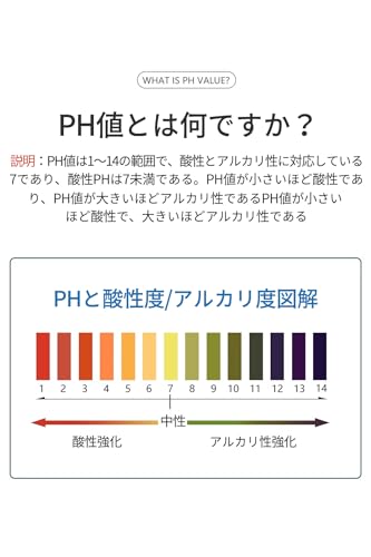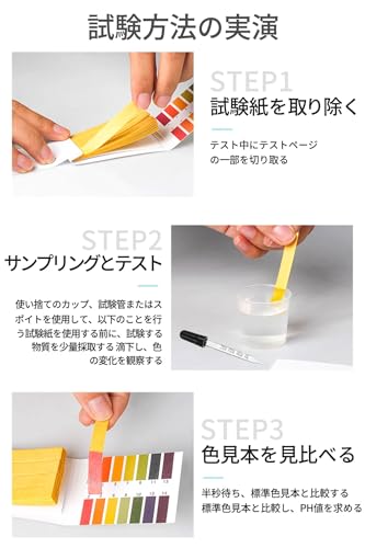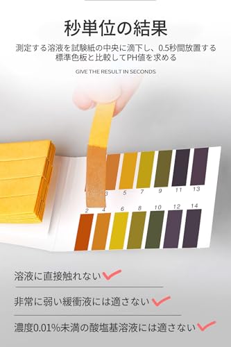 【PHを測定】測定する溶液をスティックPH試験紙に少し垂ら します、試験紙の色が変わります。変わった色をケースのPH標準色カード付と比較することで、試験液のpH測定値がちゃんと示します。PH測定の有効範囲は1-14 で測定幅が広く使いやすいです。