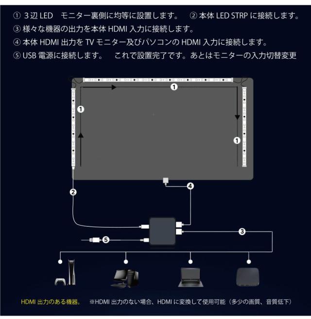 モニターの背面に取り付け、映像と同色で発行するLEDライティングシステムです。 スクリーン端の部分のカラーを認識し同色発光します。 発光色が壁を染めることにより、モニターが部屋全体に拡張するような一体感を得られます。 ゲーム部屋や書斎などの趣味部屋はもちろん、ショップの展示モニター、会議室のモニターのカスタムにオススメ! |