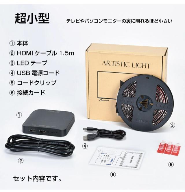 ・制御モジュール ・LEDテープ ・HDMIケーブル1.5m ・USB電源コード ・コードクリップ1セット ・取扱説明書 |