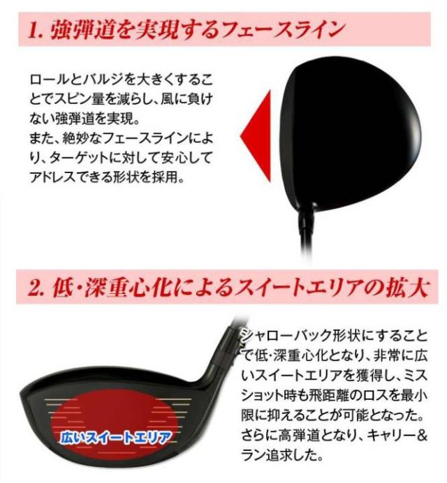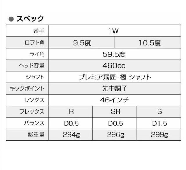 | シャフト | プレミア飛匠・極(三菱ケミカル) プレイヤーの力量にマッチした最適打ち出し角・スピン量を実現しながらヘッドスピードを最大限加速して高い飛距離性能、いつも通りに振り抜くだけでシャフトがヘッドを大幅に加速させ、抜群の振り抜き感が得られる設計がさらなる進化をとげることで究極の飛距離性能をよりラクに、より軽く、よりやさしく実現した。 |