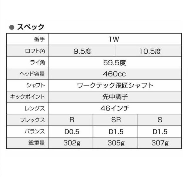 | シャフト | ワークテック飛匠(三菱ケミカル) 安定した弾道と直進性を実現。コストパフォーマンスとワンランク上の飛距離性能を兼ね備えた「新定番シャフト」。 |